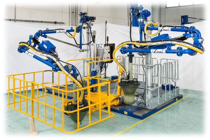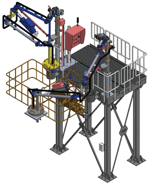 Per garantire resistenza alla corrosione, entrambi i bracci sono stati rivestiti internamente in PTFE. Sono inoltre dotati di cilindri pneumatici e valvole attuate, che consentono movimenti automatici e controllati.