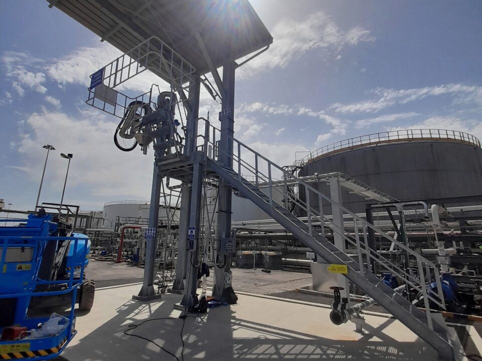 bracci flottanti per serbatoi, piattaforme di accesso alle autocisterne, scale pieghevoli con gabbie di sicurezza.